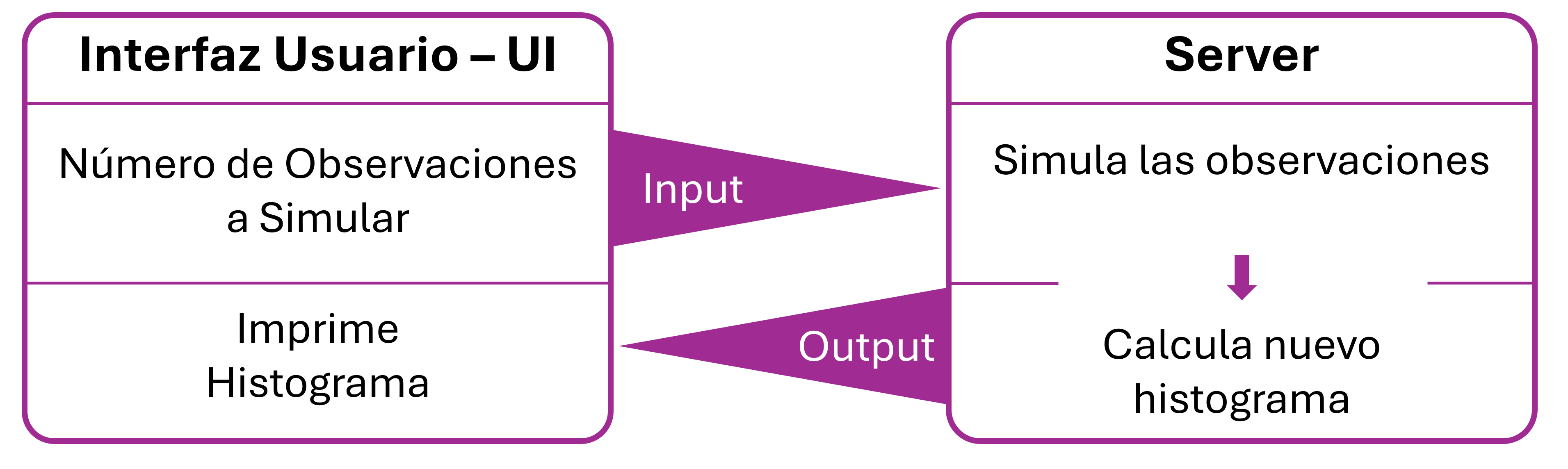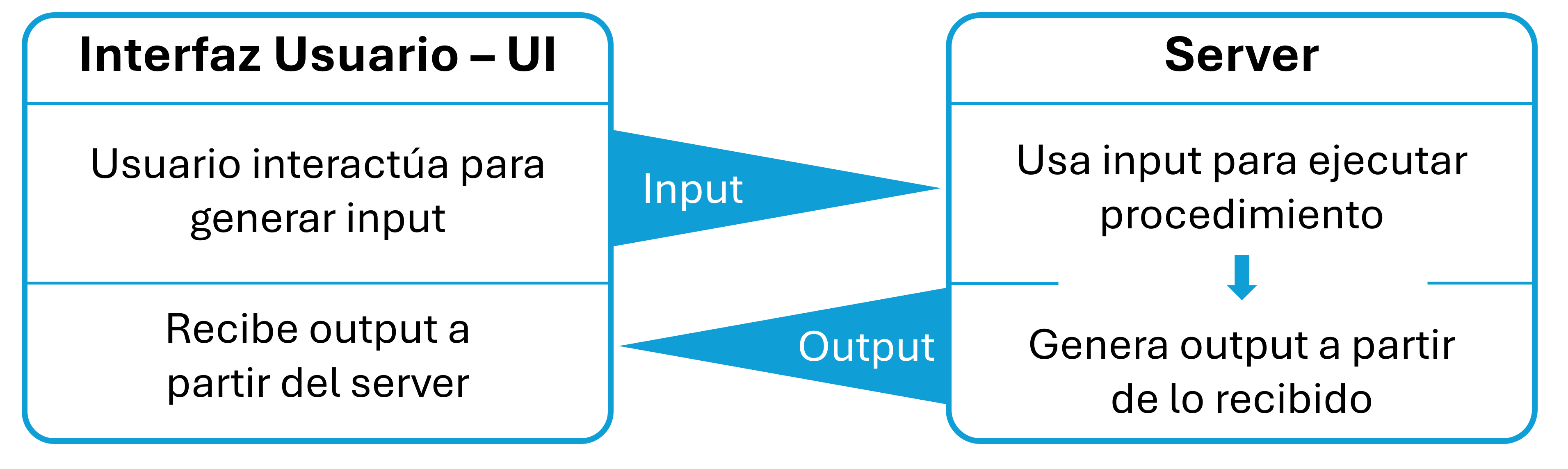 ui <- fluidPage(): página que se adopta al tamaño de la pantalla.ui <- navbarPage(): página con pestañas para múltiples secciones.ui <- dashboard(): interfaz tipo dashboard.UI: Interfaz de Usuario